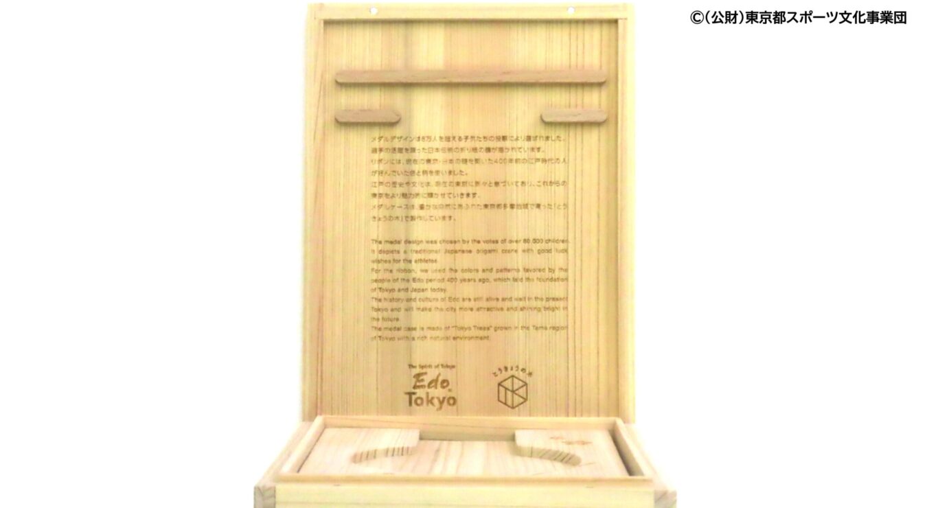 「メダルのデザインは、全国の 8 万人を超える小中高校生の投票により決定しました。“みんなで羽ばたく”を全体コンセプトとし、選手が活躍し、大きく羽ばたいていくことを願ったデザインです。表面は折り紙で作った鶴を描いています。縁起が良いとされている日本の伝統的な模様を使っています。また、裏面はいくつもの線がまじりあうデザインで、世界の人とのつながりを表しています。メダルケースは、メダル同様、選手の活躍を願った日本伝統の折り紙の鶴が描かれており、ケースを開けると、東京・日本らしさを選手に伝えるメッセージが添えられ、記憶に残る工夫が施されています。」